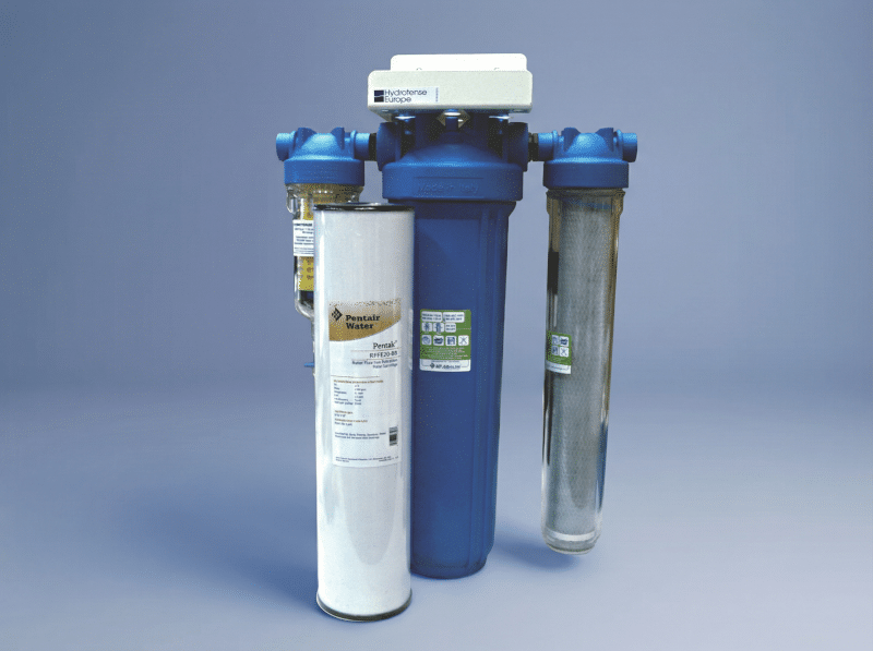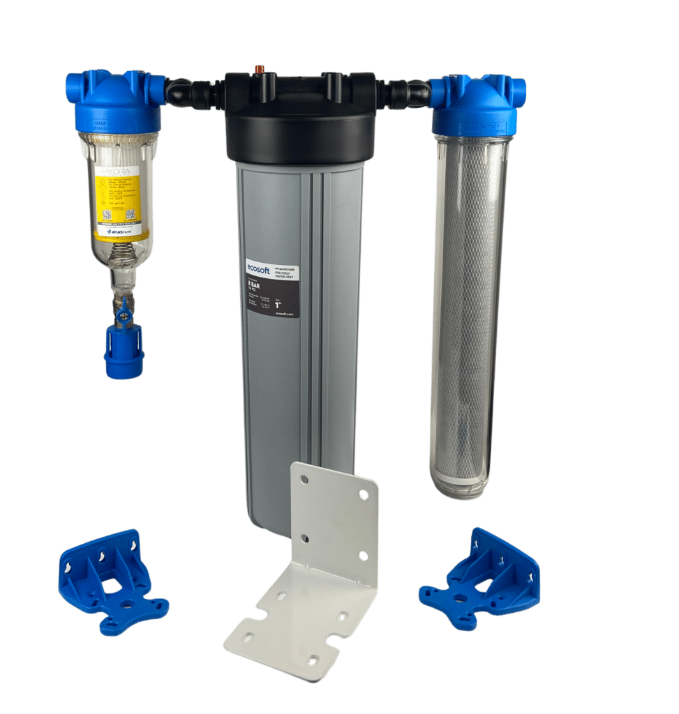 Eén complete set die het water ontdoet van vervuiling, zand, nare luchtjes, de meeste pesticiden en hoge concentraties van ijzer en mangaan. Deze 3-traps filterset heeft een grote capaciteit en is makkelijk te installeren in de koud waterleiding. Na de pomp of de watermeter.